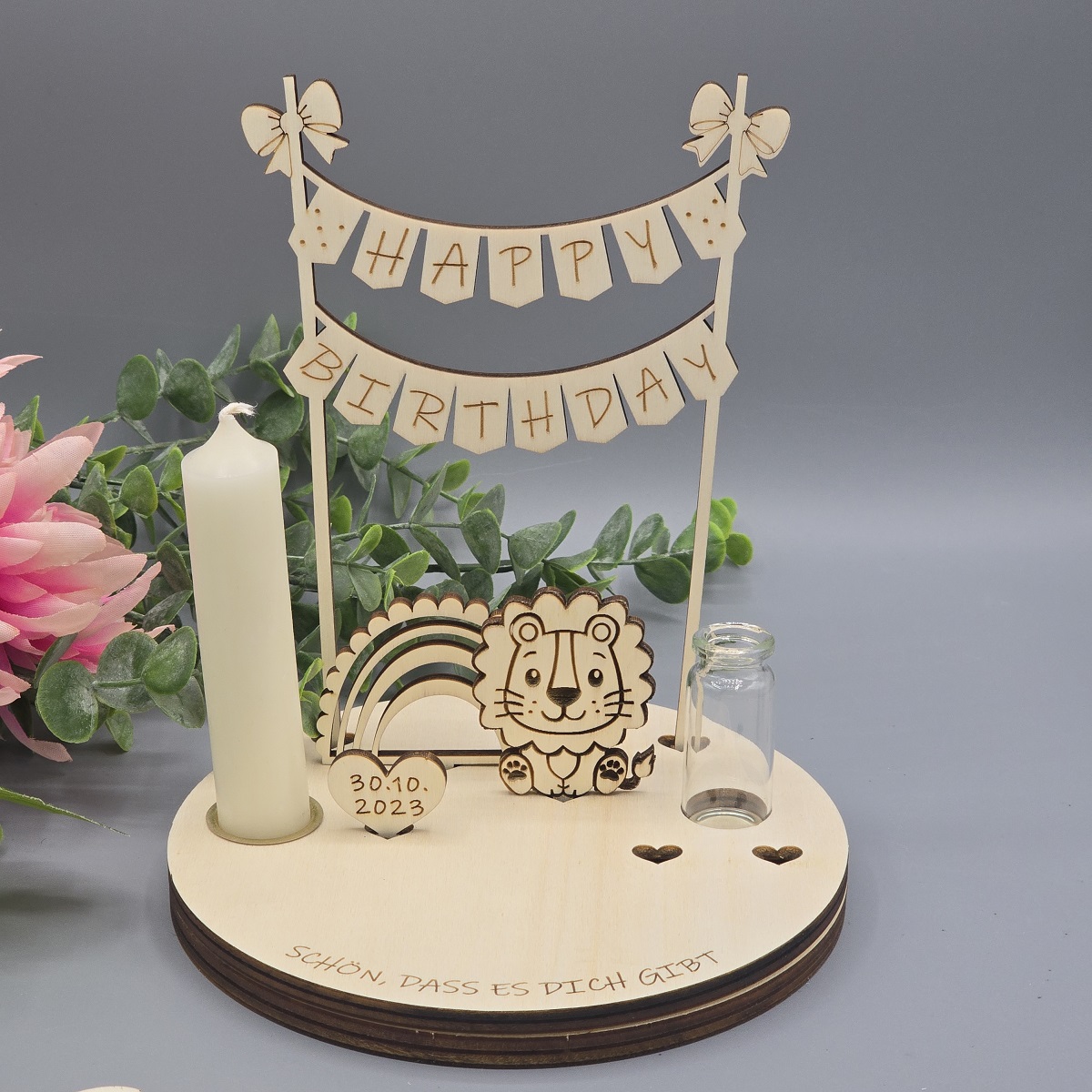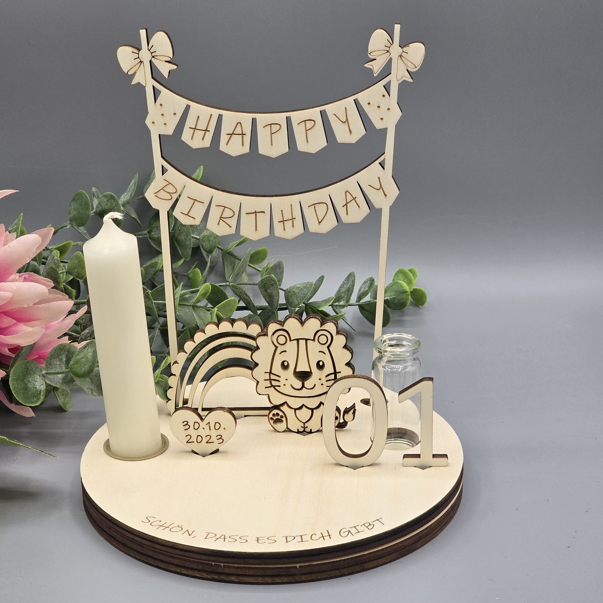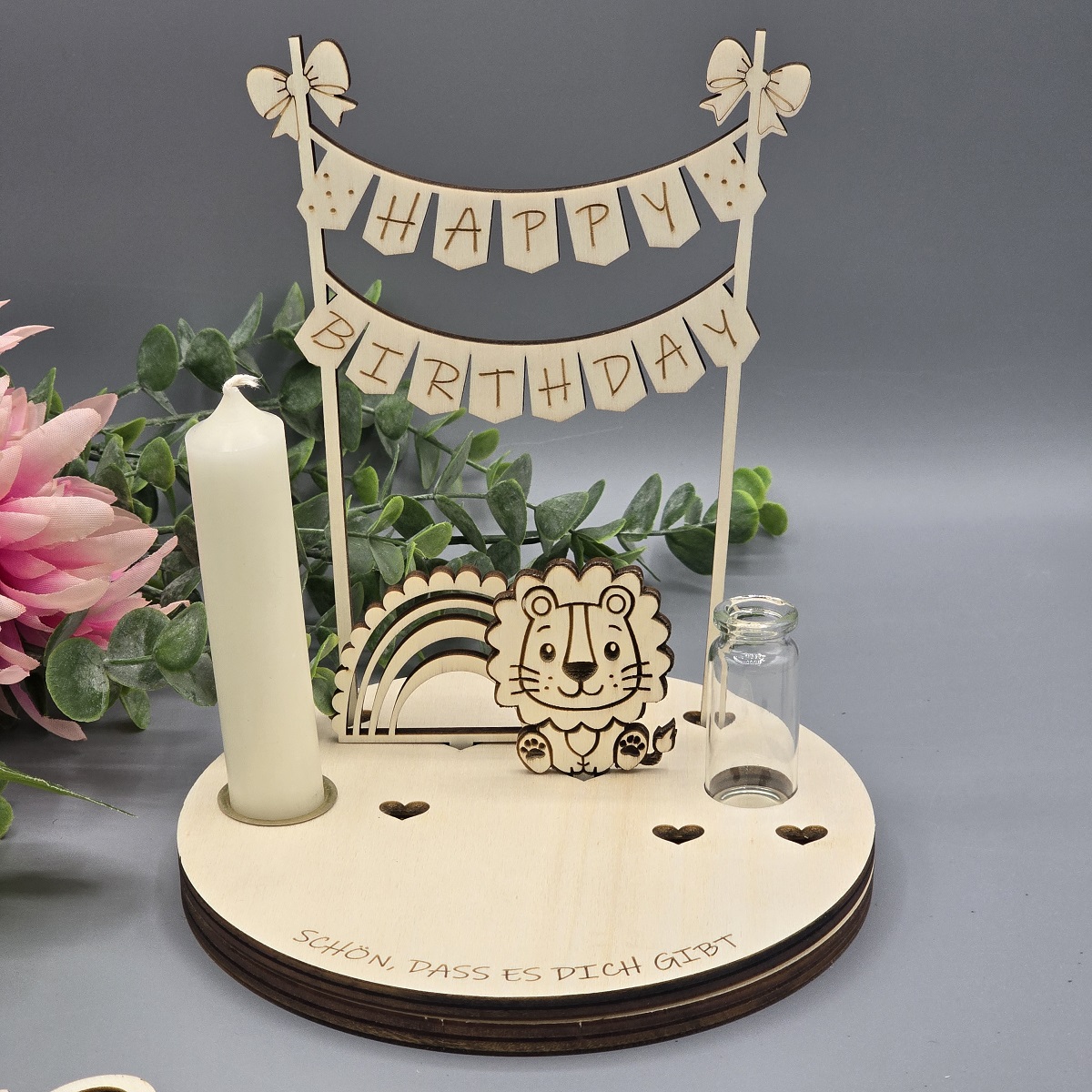 Dieser liebevoll gestaltete Kindergeburtstagsteller bringt strahlende Freude auf den Tisch! Gefertigt aus zwei verleimten 6 mm Spannplatten, bietet er Stabilität und ein hochwertiges Erscheinungsbild.