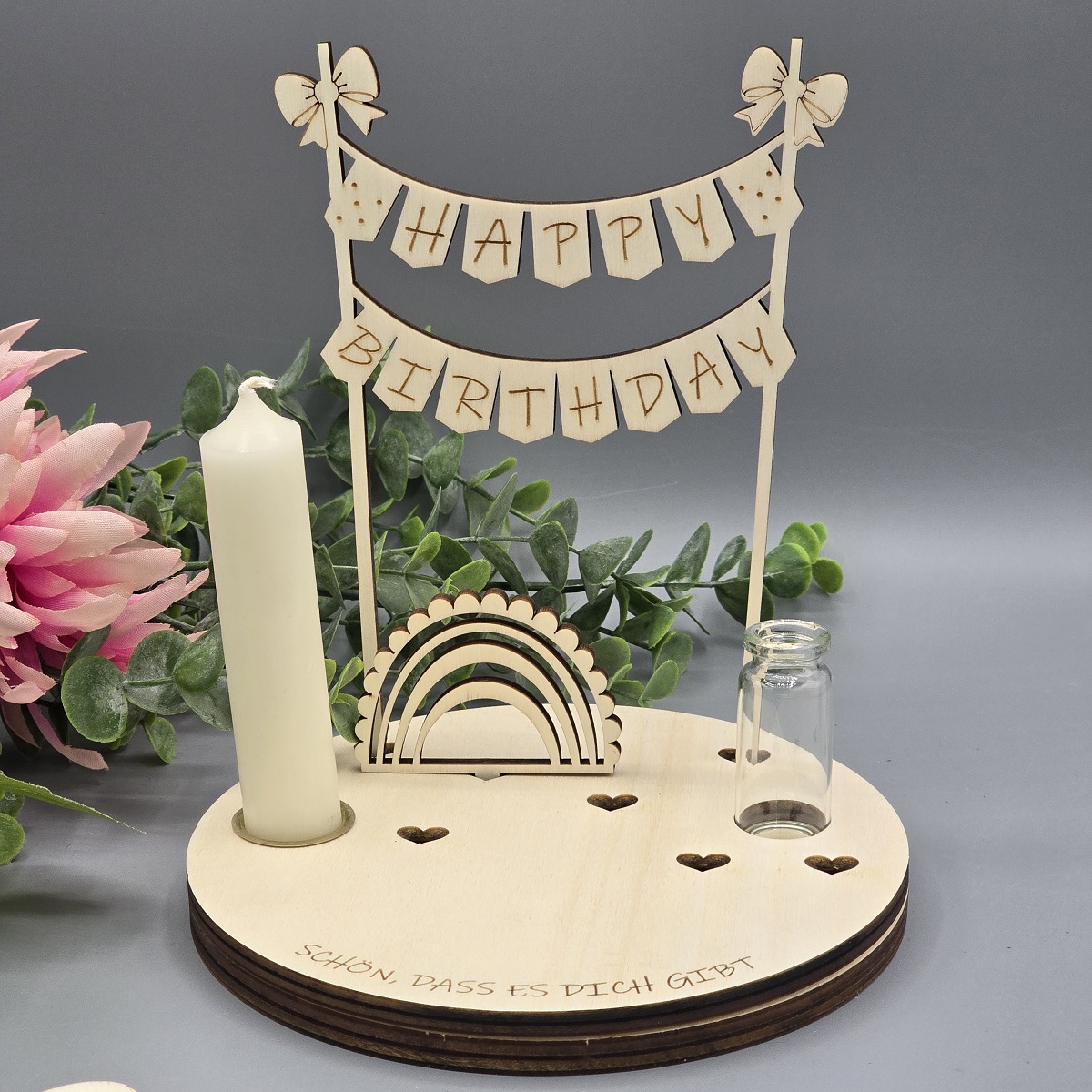 - Festliche Details: Ein Gläschen für Blumen und ein Kerzenhalter für die Geburtstagskerze.