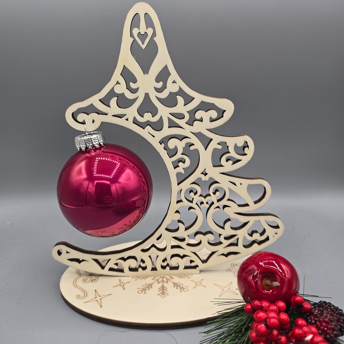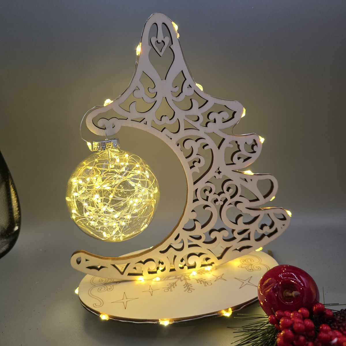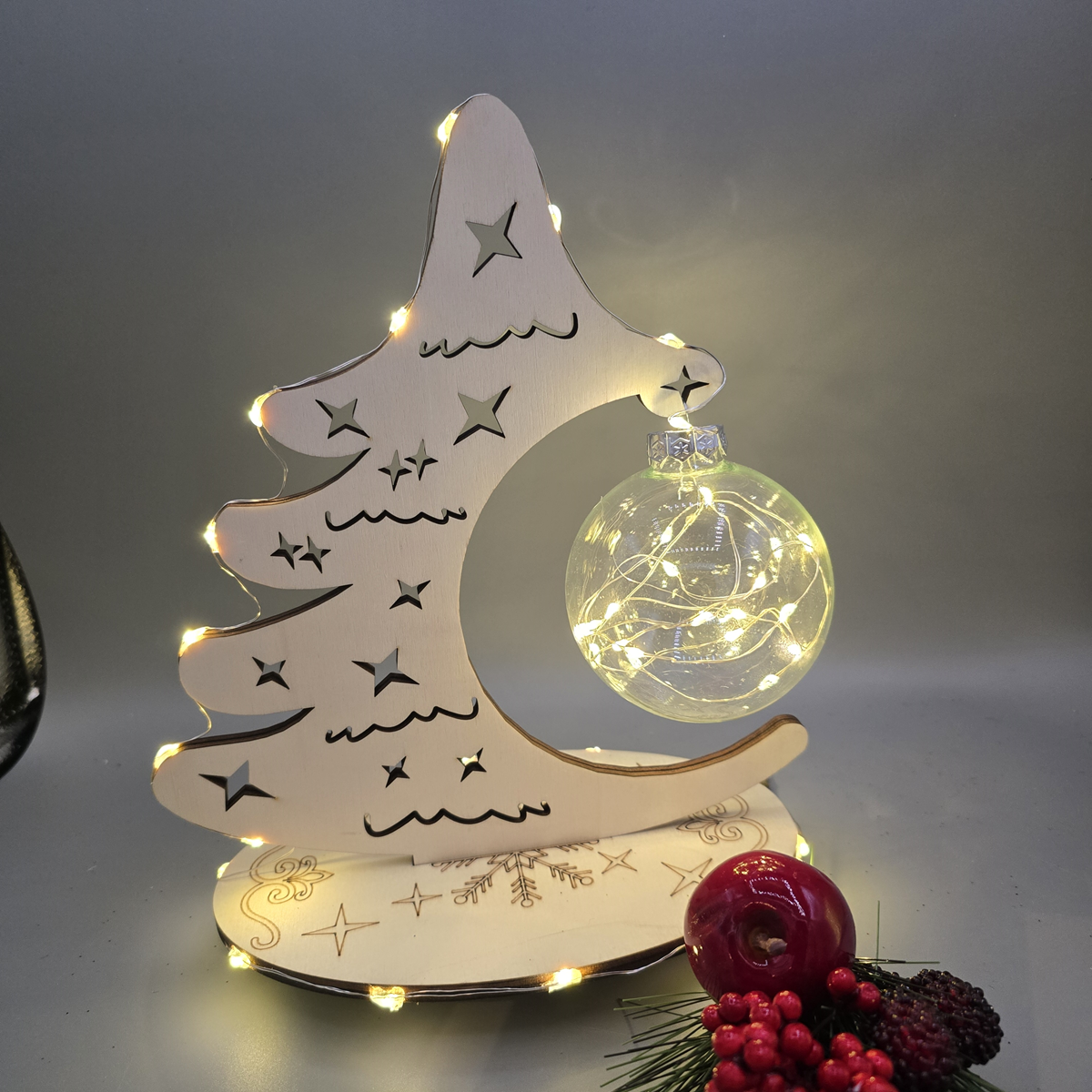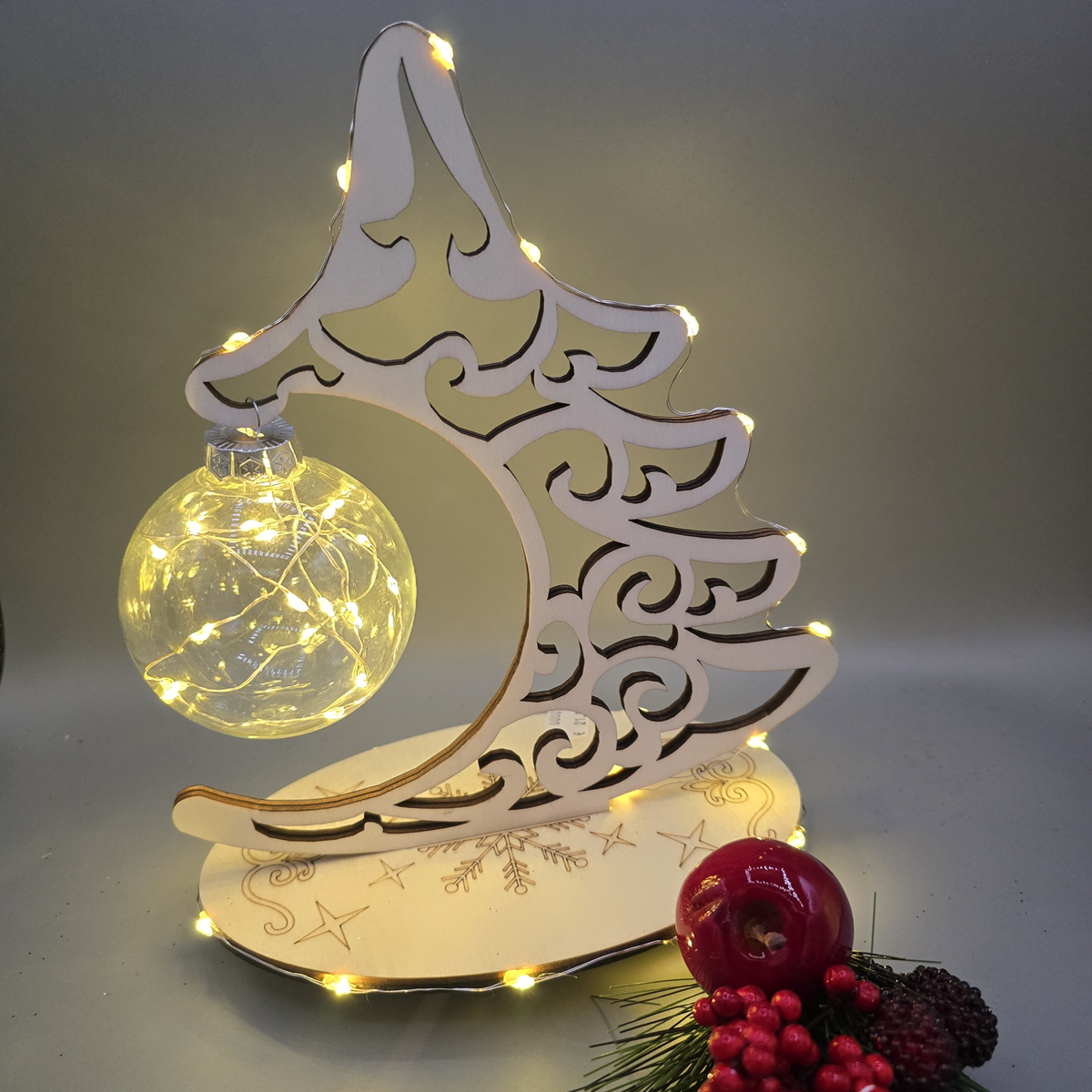 Dieser stilvolle Baum aus 6 mm starkem Sperrholz ist die perfekte Ergänzung für Ihre Weihnachtsdekoration. Mit seiner natürlichen Optik und der hochwertigen Glaskugel in der Mitte verleiht er Ihrem Zuhause eine festliche Eleganz. Der Baum ist in drei unterschiedlichen Designs erhältlich und kann individuell gewählt werden – ob schlicht, mit Beleuchtung, oder mit funkelndem Glitzer.