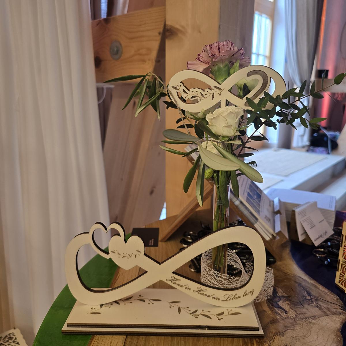 Graviertes Unendlichkeitssymbol aus Sperrholz mit Reagenzglas für Blumen